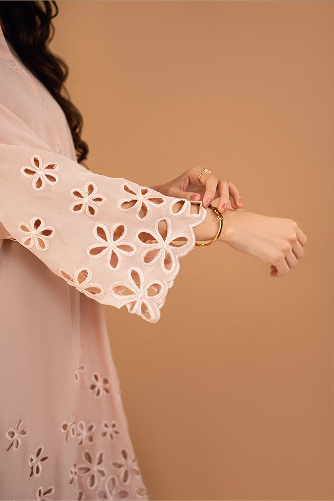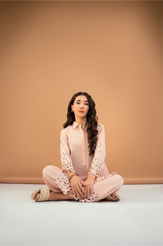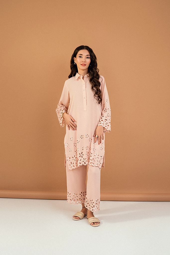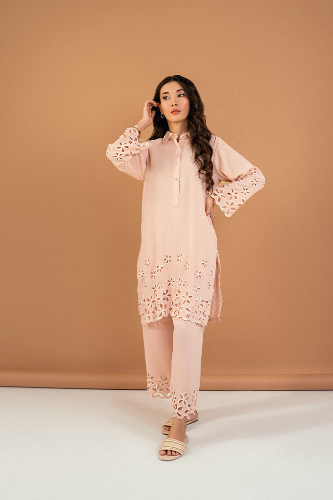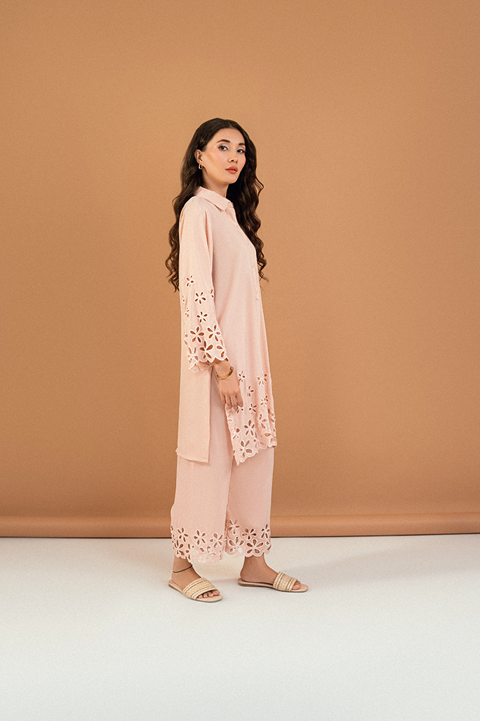 A graceful blush pink 2-piece outfit featuring delicate floral cutwork on the shirt sleeves, hem, and trouser cuffs. Designed with a collared neckline and button-front shirt, paired with straight-cut trousers for a comfortable yet elegant look—perfect for everyday and semi-formal