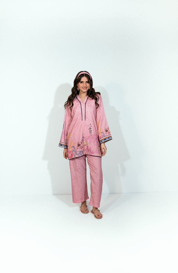 A chic pink short shirt paired with straight-cut culotte trousers for a clean, modern look. Made from wrinkle-free blended cambric — perfect for effortless everyday wear.