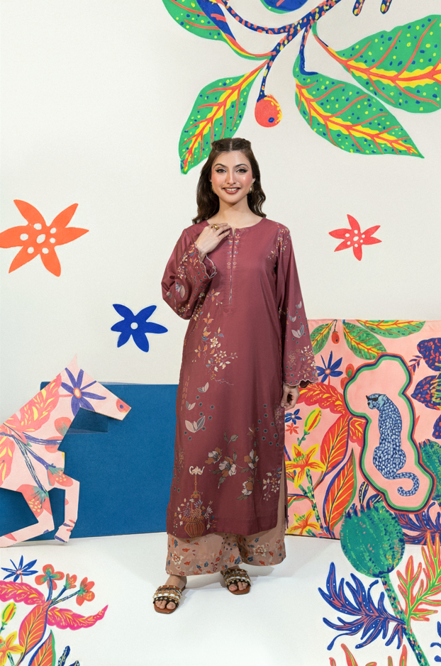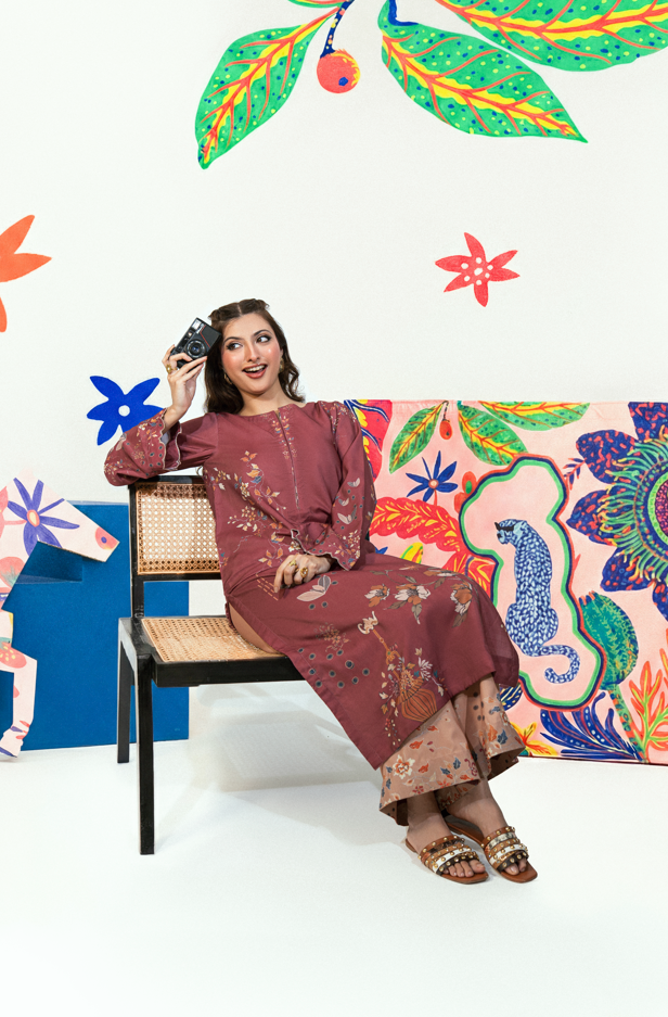 An elegant maroon long shirt with refined cutwork detailing on sleeves, paired with culotte trousers. Designed in wrinkle-free blended cambric for a polished yet comfortable look.