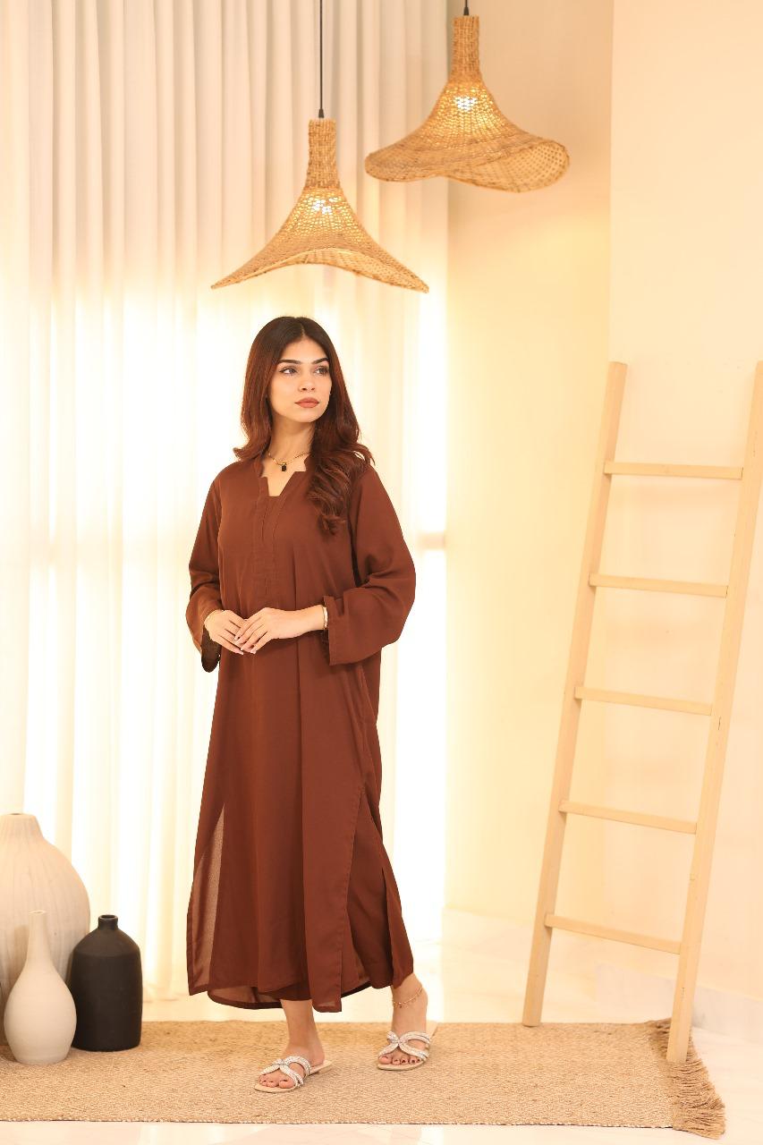 A long, straight silhouette complements various body types, offering a relaxed yet sophisticated look. The side slits provide ease of movement and a touch of modernity. Its V-neckline adds a flattering touch.